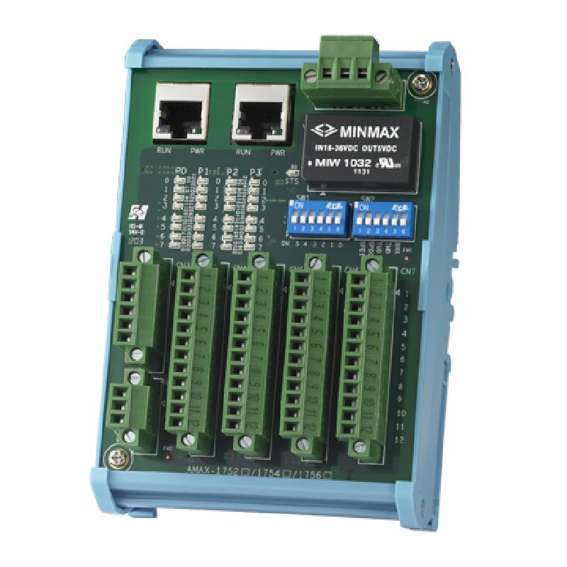 - AMAX-1000系列數字量I/O從站模塊為緊湊基板式設計,可以水平安裝。板載接線端子方便直接連線,具備LED指示燈方便調試診斷。所有數字量I/O從站模塊均可以標準以太網線纜進行分散式分布和連接,節省布線時間和維護成本。目前該系列共有三個型號:32路數字量輸入模塊(AMAX-1752),32路數字量輸出模塊(AMAX-1754),以及16路數字量輸入/輸出模塊(AMAX-1756)。使用最大通訊速率時,2048個數字量I/O點可以在短至1.04毫秒內掃描和刷新。