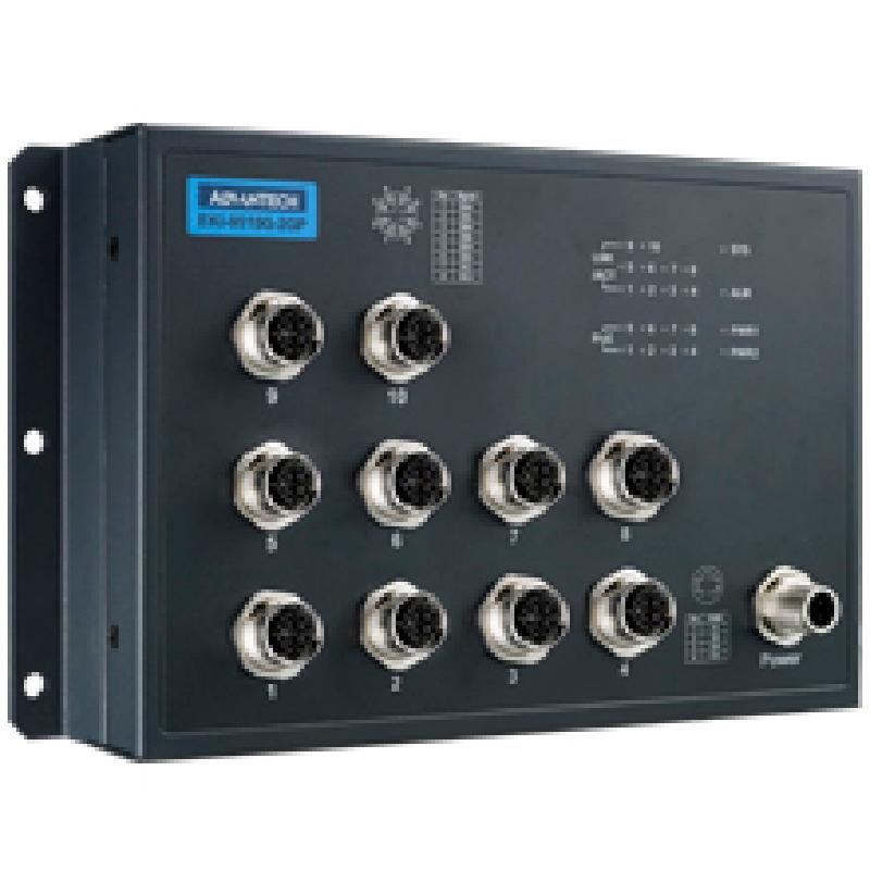 - The EKI-9500 series switch is designed for railway application with rugged and high EMC performance, being suitable for networking solution for rolling stock and wayside applications. The EKI-9500 series provides M12 connectors for Ethernet/ console/ relay/ power-input connections to ensure tight & robust connectivity, and thus to guarantee reliable operation against environmental disturbances such as vibration and shock on train. The EKI-9510E-2GPH & EKI-9510E-2GPL are PoE Ethernet switches that provide 8 x Fast Ethernet M12 D-coded ports with IEEE802.3af/at PoE(Power Over Ethernet) function. The PoE ports can provide up to 100Watts power budget for P.D. devices (such as camera, IP-phone and wireless access point). Each of them also provides 2 x Gigabit Ethernet M12 X-coded ports with Bypass function to increase the reliability of the network. EKI-9510E-2GPH/ PL features a "flat" design which can be easy deployed with its slender size and make network deployment easier in crowded carriage/ cabinet.