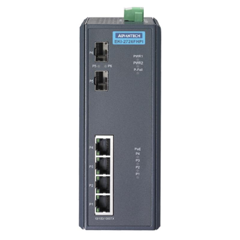 - EKI-2726 FHPI 交換機擁有 4 個 10/100/1000以太網PoE端口及 2 個 SFP 插座, 每個PoE端口可提供 30W電源輸出。作為經濟型解決方案,其支持寬工作溫度,滿足高可靠性及高標準工業應用要求。同時,EKI-2726 FHPI符合IEEE 802.3 at 標準。